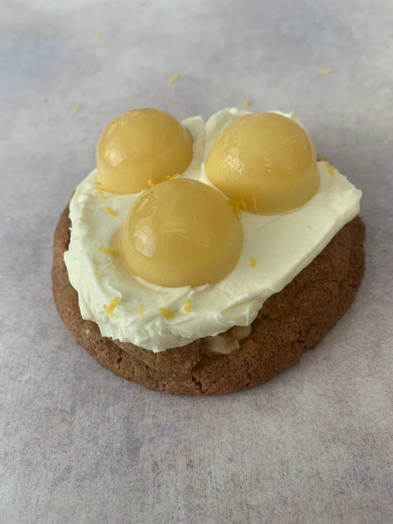 A white chocolate chip cookie topped with a mascarpone based cream and 3 limoncello jello shots!